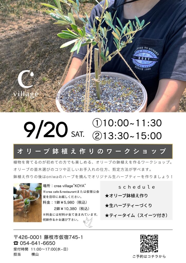 9月20日(土)、crea village “KOYA” にて「オリーブ鉢植えづくりのワークショップ」を開催します。